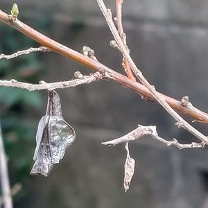 庭のユキヤナギの枝に 極小の宇宙船の様なもの発見👀 画像検索したところ ホシミスジという蝶の蛹に激似 しかし色々読んでみたら 本来は右にぶら下がっている 葉っぱの巻いたのの中で幼虫が越冬して 春に葉っぱから出てきて緑の葉っぱを沢山食べて 4~5月頃蛹になって数日で羽化するのが普通らしく では 今蛹というのは去年の春 蝶になれなかった蛹という事なのか そう思って見ると写真で見たそれよりも 何となく黒い様にも思えた でも初めて出会った蛹なので 出来れば蝶になって欲しいけど… この葉っぱの巻いたのの方に 幼虫が入っているならば… きっと越冬して春に蛹になって欲しい そう願いながら見守って行けたらなと そっとしておくことにした p