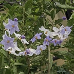 ツルハナナス(蔓花茄子) 咲き始めは白くだんだん薄紫へと花色は変化する 暑さ、寒さにも強く育てやすいとか