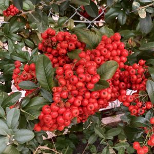 ピラカンサ 和名は(常盤さんざし)とか たわわになっている赤い実には毒性あり 冬の寒さで毒性が無くなり2月頃?には鳥のご馳走になるらしい
