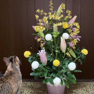 アレンジとニャンニャン祭り 新しいアレンジをモミジちゃんがチェックに来ています ここで使っているオンシジュームは家で咲いた花をカットしたものです
