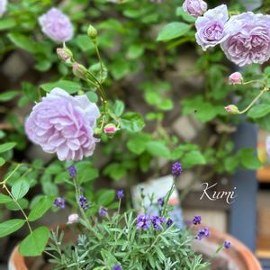①バラ“レイニーブルー“ 毎日、どのバラが咲きそうかな〜?と庭に出るのが楽しい季節になりました🥰 バラの足元には、ラベンダー“アヴィニョン アーリーブルー” 細くスマートな姿が魅力のイングリッシュラベンダー🪻 紫✖️紫で爽やかなコーナー ②お迎えしたばかりの タカザワファームさんオリジナルの キンギョソウ“アールグレイスモア” 斑入り、サビ模様のリーフでモフモフがかわいいです♡
