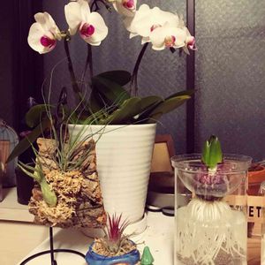 我が家の植物さんたちその1です。 お花屋さんで処分品だった胡蝶蘭、ダイソーチラさん、ホームセンターチラさん、ホームセンターヒアシンスさん。 胡蝶蘭はクリスマスに我が家に来たけど、まだ綺麗に咲いてくれています。 花持ちが良いですね。 ダイソーのチラさんもなかなかです。 赤いチラさんはホームセンターから来ました。スノーマンに植えたらスノーマンがファンキーになって気に入っています。 ヒアシンスはこの横にあと2つ居ます。 球根用のベースとフラワーベースにスタバのフラペチーノの蓋を被せたものと、上下ともスタバのフラペチーノのカップを利用したものがあります。 花が咲くのが楽しみです。