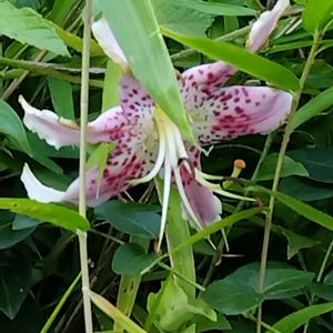 カノコユリ ユリ科ユリ属 多年草 別名はドヨウユリ、タナバタユリ 自生は九州(主に薩摩半島から長崎県沿岸)や四国(愛媛県や徳島県の山間部) 和名は花弁に鹿の子模様があることから。 草丈は1〜1.5m 直径約10cmの花は美しく、昔から観賞用に栽培されている。 花期7〜9月 花言葉は「荘厳」「慈悲深さ」 🏷️木曜日は桃色 に参加させていただきます。