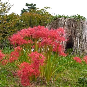 お寺の一角で、切り株をバックに鮮やかに咲いていた♥️ヒガンバナ♥️のお花です🥰💞