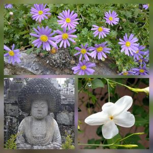 寒い雨が続きますね☂️☂️ 雨の上がったすき間に散歩した道で出会ったお花です💜🤍 左下は以前アフロ地蔵でちょっと話題になったお地蔵さんです🤭