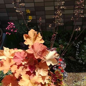 昨年秋 寄せ植えから地植えにしたら モリモリ生長してしまいました😂💕 オレンジ🧡がかった微妙なお色が素敵です〜(๑>◡<๑)♡! こんなに大きくなるとは思いもしなかった〰💦💦💦他のヒューケラの倍程に‼️ 花はまだです〰😱