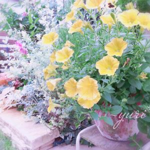 ❁ペチュニア❁ おはようございます😊☘️ 去年から冬越ししモリモリになりました💕その分、水切れも早い😁💦 くすんだ黄色なので浮かずに場も明るくしてくれるペチュニアさん🌿