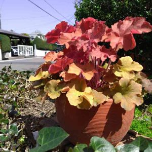 ヒューケラキャラメル若葉が赤くて、とても華やかです。 玄関の目立つところに鎮座中(^^)/