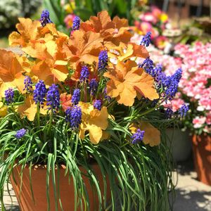 掘り上げて倉庫に放置されてたムスカリの球根と、寄せ植え解体したはいいけど植える場所ないと思ってたヒューケラを昨秋に植えたら、なんかすごくいい感じにムスカリ出てきた(笑)