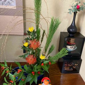🎍明けましておめでとうございます 今年もよろしくお願いいたします 今日のお花 若松に松ぼっくりがついていました