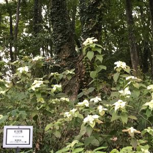 山紫陽花 紅冠雪 コウカンセツ 町田市薬師池公園の山肌にありました。 遠くから白い葉が目立っていて なんだろう? 名札がありました。 紫陽花の仲間でしたね。 班入りの葉が特徴。夏になると新梢の上部の葉が白くなる。 とありました。