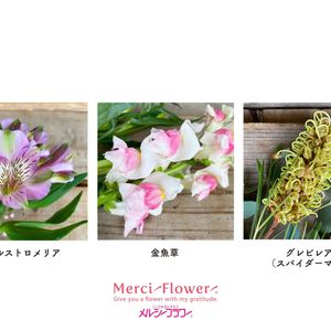 雨の日は、 花を眺めよう。 ・ 朝から激しい雨の関東地方☔️、 メルシースタッフも大雨の早朝から スーパーへお花をお届けしています💦 ・ ちょっぴり憂うつになりがちな お天気の日こそお花を飾って 心身をリラックスさせたい❣️ ・ さまざまな研究からも、 3分ほど静かに花や植物に触れて眺めると、 心理的ストレスが減少して脈拍も下がる という結果が出ているそうです🌈 ・ 今日から早速やってみてくださいね🌸 ・ さて‼️、 花を眺める良い機会に こんなお花の豆知識もご紹介♫ ・ たとえば、 アルストロメリア🌈、 花びらのなかに斑点模様のものがありますが これは蜜を吸いに来る昆虫たちを 蜜の場所まで誘導するための しるしなんです✨✨✨ ・ お次の スナップ、日本名で金魚草は その名のとおり金魚のような花姿で 可愛いことから名付けられました❤️ ・ 最後のクルクル植物、 グレビレアの品種はその名も スパイダーマン😎😎😎、 日本ではなかなか見かけない品種で ドライフラワーにも最適です✨ ・ ご紹介したお花たちは スーパーのお花売り場にお届け中🌸、 他にもたくさんの種類のお花があるので お気に入りをお花を見つけて飾って ゆっくり眺めてみてくださいね😌😌 ・ お花で優しい時間を お過ごし下さい✨🌈 ・ インスタグラムmerciflower_officialでも、 写真や動画で情報をアップしているので、 『詳しく見る』からチェックしてみてくださいね🎵 ※フェアおよび商品は、店舗・地域によって異なります。 ※商品はなくなり次第終了となりますので、ご了承のほどお願いします。 ※ご自宅・最寄りのメルシーフラワーがお届けしている店舗を知りたい方は、お手数ですがメルシーフラワーホームページのお問い合わせフォームよりご連絡ください。