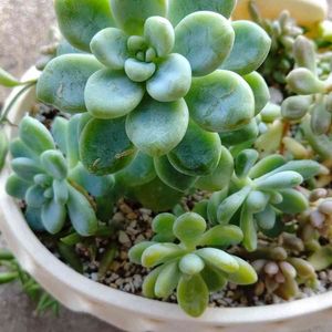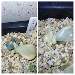 昨年も書きましたが 子宝草を育てようと思ったきっかけは 三好の喫茶店でみかけた 朧月との寄せ植えでした それは子宝草の方が大きく 美しい緑で 朧月が それをいっそうひきたてて どちらもが素敵に見える 組合せだったのです さっそく真似てつくった この鉢 雨ざらし日さらし 大事にしてませんが 少し その良さが 解りませんか? 夜になってしまったから もぅひとつですね💦🥶 鉢増しして 出直しだなぁ 🤭