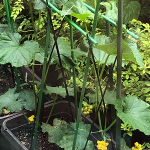 今年4年目、プランター栽培のきゅうりでございます。 5月初めに父が10日間ほど入院してしまい野菜の苗を買いに行く時間が遅くなってしまいました。5/22ようやく定植したきゅうりの花が咲きました。 でもこの花を育ててはダメなんでしたよね?確か。 昨年下の方にたくさん花が咲き、農家の友人にたくさん花があるけどこれは全部きゅうりになるのか確かめたところ、それを育ててはダメで、その芽をかいて脇にたくさん出てくる子や孫となる蔓を伸ばし、そこになる実を育ててねと優しく言われました。 今年はそのことを念頭に子や孫蔓を大切にしたいと思っています。