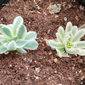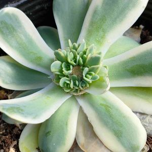 安定した太白覆輪が特徴の斑入り子持ち蓮華『鏡花』✨ ほんのりピンクに色付いてる〜☺️ この子はサンキュー多肉さんから頂いて、オロスタキス直射部として南側コンクリ庭の直射日光で育ててる子☀️ 可愛いのに強い💪