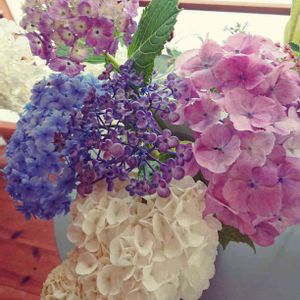 今日は朝から雨降り。 週末に 夫の釣った初カツオの お裾分けのお返しに、 庭友達さんから お庭の紫陽花の花束💐 頂きました🍀 今朝窓辺に生けた紫陽花✨ みんなちがって みんないい☺️
