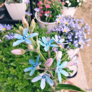 ①今日の花はブルースターということなので最近我が家でお迎えしたブルースターをパチリ📸 この水色の可愛い花を見るたびホッコリ気分にしてくれます。 お迎えして良かったお花です ②同じくブルー系のロベリア レオン スカイブルー ③我が家のバロータにも紫色の花が咲きました🌼 ④青系じゃないけどオマケのピンキーのpic ショッキングピンクの花です😀