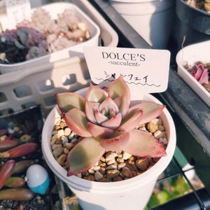 ドルチェさんの多肉弁当に入っていたシャンフェイ なんとも言えない淡いピンク色がとっても素敵✨️ 今日は天気がいいので多肉達に底面吸水させてます😙