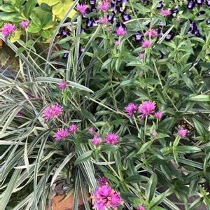 ゴンフレナ・ラブラブラブ 花言葉:「不朽」「不死」「変わらぬ愛」「色あせぬ愛」「永遠の恋」「永遠の命」「安全」 ヒユ科ゴンフレナ(センニチコウ)属🌿一年草 冬越しした株です🌿 センニチコウ(千日紅)の改良品種😊暑さに強く、連続開花性に優れ、春から晩秋まで咲く🌼🌼🌼