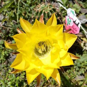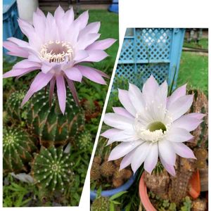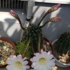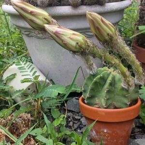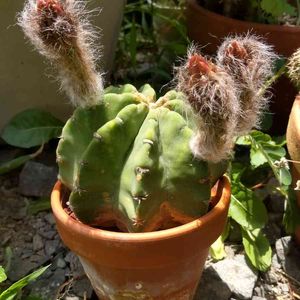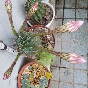 今晩辺り開きそうです🌸👍 本体高さ25cm 蕾部分も20cm超 美観的にバランスを欠いていますが😆こういうトゲ族も我が家におります🌵 記憶が確かなら、20年程前に胴切りした下部の方から縦に伸びたものです。桃花短毛丸の交雑種で、子吹きから育った株も3つ程おります。 日焼けも子吹きも基本は放置で20年。 たくましいです😎🌴