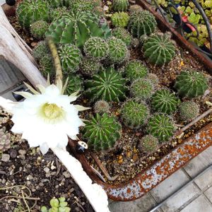 こんにちは🎵 サボテン短毛丸✴️✨ 花が咲きました。 サボテンもバーベキューコンロ一杯になってきました~🍀