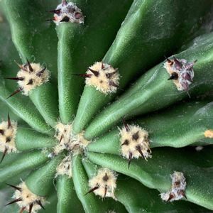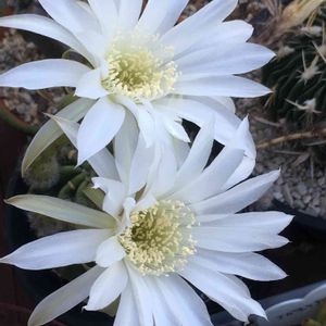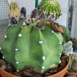 お願い🙇♀️ サボテンの種類の名前、教えてください。 うちに数年一緒に暮らしているサボテン軍団がいますが、 右下:サボテン科エキノプシス属 短毛丸、 左下: サボテン科 マミラリア属 月影丸 Mammillaria zeilmanniana (CCCRスキさんに教えていただきました😊 以外、種類の名前がわかりません😅 それと、一度も花を見たことがなくて 花を咲かせるには、何かトリックがあるのでしょうか?