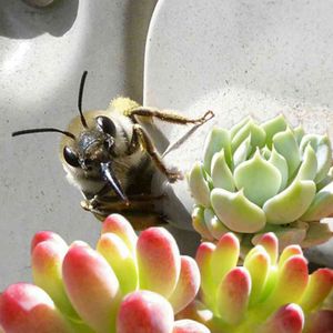 飛んでキタ━(゚∀゚)━! 🐝蜂っ❣ ベランダの室外機にしがみついてます。 こっち見てますʬʬʬ ハンパなく目が合いますʬʬʬ 消されないヨウニ多肉入れてコラ しときました♪。.:*・゜