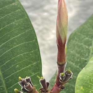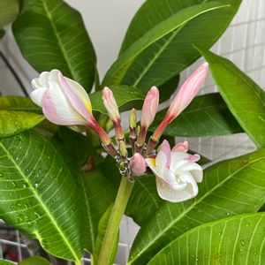 プルメリア ブリザード とっても良い香り〜🥰 花芽が伸びてきた所でニャつ🐱が網戸のゴムを押し除けてボギーーーーっと引っ掛けて脱走😱 春から楽しみにしていたのに😭😭😭 怒るに怒れず💢しょげていたら新たに花芽を見せてくれました。 良かった😮💨 良かった😘