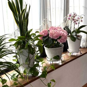 出窓に置いてる花と観葉植物 アジサイセンセーションを鉢植えにしたら意外と持ってます。 もうあと1週間ぐらいかな? ポトスがかなり伸びてます❤️ オリヅルランもランナーがたくさん出てます🩷