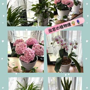 出窓の植物達です② アジサイピンクセンセーションとミディ胡蝶蘭に入れ替えました💕 観葉植物の寄せ植えのポトスが伸び伸びに‼️ オリヅルランのランナーもたくさん出てます🩷❤️