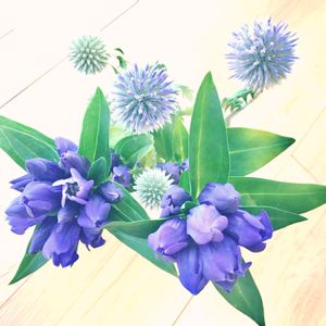 次はリンドウと、佐野農園さんのルリタマアザミを生けましたよ❣️ リンドウはあまり開きませんが、素敵ですね💙 ルリタマアザミと一緒に上から撮ると、不思議な雰囲気になりました🦠✨