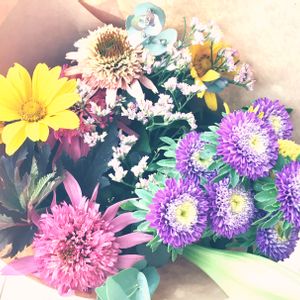 さとまるの森さんの花束の中で、1番気に入ったのがこのアスターです😍 コロンとした形に紫から黄色のグラデーションがとても可愛いです💜💛