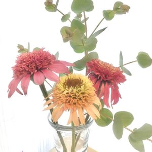 次はエキナセアとユーカリを合わせてみましたよ❣️ エキナセアは3輪とも、種類が違うようですね。それぞれ綺麗です😊💕 うすーいオレンジの子も、モコっとしていて可愛いです🧡