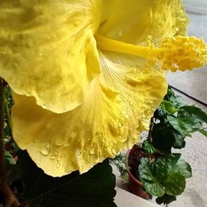 明け方の強い雨☔にも負けず 知らない間に咲いてました💛🌿 挿し木から育てた レモン色のハイビスカス 見て見て❣️ 可愛いね〜中まで優しげな黄色です