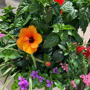 土岐アウトレットにて、寄せ植えが素敵でした。 ハイビスカスが寄せ植え🌺 斬新で、大きい😳