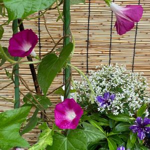 おはようございます。 💙☔️雨の朝です。 明日も一日中雨だそうです。 もう これ以上の災害が起こりませんように💙 今朝の庭のお花 *朝顔 本当は 3種植えてありますが なかなか 一緒には咲いてくれません。 *ユーフォルビア 🤍ダイヤモンドスター 八重咲き *ニチニチソウ ビアンカ 💜流星