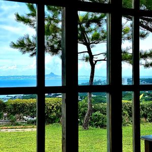 小高い丘のカフェからの眺め 向こうに見える島は伊江島(沖縄)です 琉球松には小ちゃな松ぼっくりが...😊