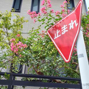 ご近所の百日紅 一時停止標識と色彩比較すると、赤ではなくピンクですね😁