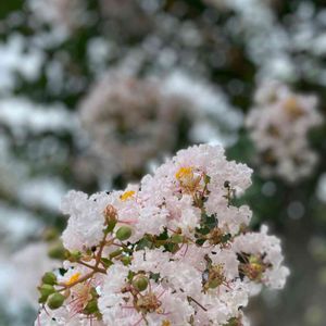 おはようございます🎶 🌸🤍サルスベリ🤍🌸 うっすらピンク色 曇っているので青空が見えないのが残念です。 我が家のサルスベリはかなり遅咲き、 今が満開です❣️ ふわふわと綿菓子のようです😊