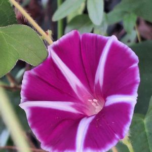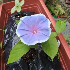 おはようございます👋😃☀️ 曜日朝顔(ヨウジロアサガオ)が 咲きました💠 花弁に白くラインが入り可愛らしく咲いてます➰🎶 去年はブルー系でしたが、今年は多分無人販売にあった無料の朝顔の種がこの朝顔だと思います😊