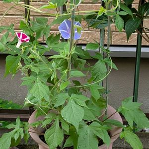 種まきしたアサガオが開き始めました😄 大きく育った苗を地植えにし、残り3つを鉢植えにしました🌿 別々の色で咲いてよかったです💕 地植えの方は紫が咲きはじめたばかりです💜