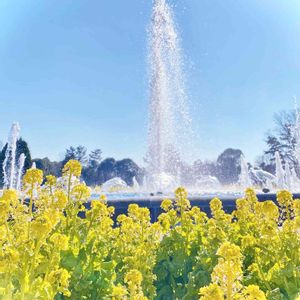 菜の花と噴水✨🎀 今日は ひさびさに 元気が出るような 良い気候だった🌼