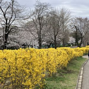 散歩コースの花🚶♀️🐶🌸 ①レンギョウとソメイヨシノ ②ユキヤナギ:毎年遅い時期に剪定するのでヤナギにならない😆でも白の小花は清楚でステキ🤍💓 ③カシワバアジサイの新芽 ④いつのまにか梅の赤ちゃんが👶 雨が止んだ合間に冬コート着て手袋🧤してイヤイヤ(私が)だけど犬散歩に🐶桜は咲けどさすがヒトケが無し🌸
