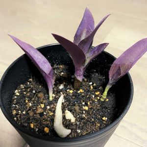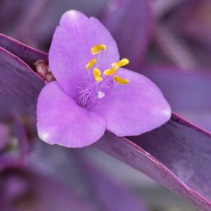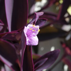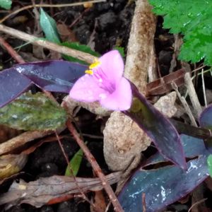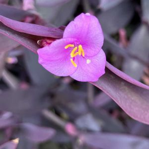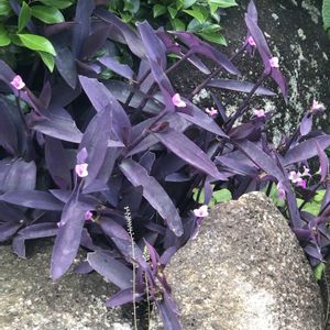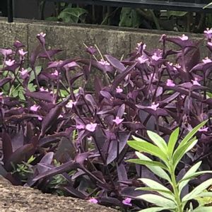 夏に 濃い桃色で 径2センチほどの花を付けます。 葉は紫色の長楕円形🟣 葉全面に白く柔らかい毛が生える 紫御殿(むらさきごてん) ツユクサ科