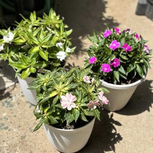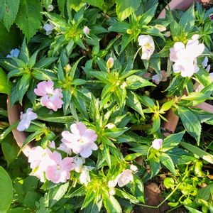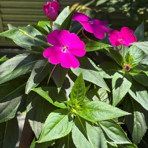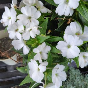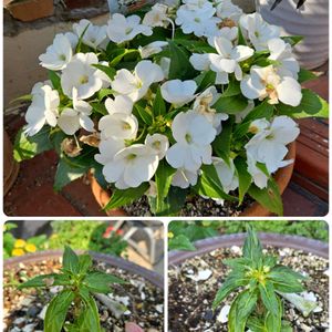 サカタのタネ サンパティオモニター報告 ①②植付けから3ヶ月程経過しました。3株の様子です。 1ヶ月前に摘蕾をしましたが、ぼちぼち咲き始めました🌸 ⚫︎ホワイト、葉焼けが目立ってきたので半日陰の場所に移動していましたが、下葉の黒ずみと落葉が続き下葉が少なくなりスカスカに。遮光ネット下に移動しました。 ⚫︎パープル、縦に葉が丸まりやすくこの株だけ1週間前にワンサイズ鉢増し。まだ丸まりはあるものの花も咲いてきて安定しています。 ⚫︎ブラッシュピンク、ハダニと思われる症状治らずシャワーや殺虫剤をかける事で様子見しています。