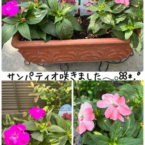 サンパティオモニター報告𓂃𓂂ꕤ*.゚ 植え付けから約10日。 お花が咲きました𓂃𓂂ꕤ*.゚ ホワイトはまだこれから。でも蕾が膨らんできましたよ! ブラッシュピンクが、植え付け後に日当たりのいいところに置いておいたら、萎れて葉がやけてしまいました💦 一緒にパープルも置いていたのだけど、配送されたばかりの時も、パープルの方が元気で、ブラッシュピンクが水切れっぽく萎れかけていたからかなぁ🤔(すぐ復活したからあまり気にしてなかったのだけど) 置き場情報を午前中だけ日の当たる東側に移動したら、それから調子いいです。 夏日の西陽はあまりよくなかったみたいですね😂 もうすぐホワイトも咲きそうだし、ますます楽しみです✨