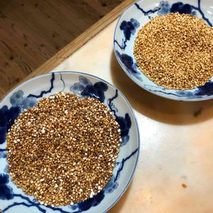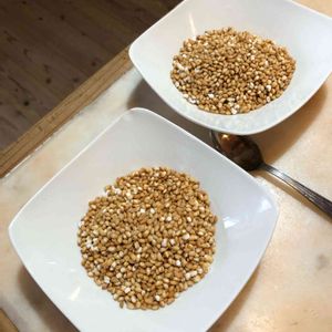 炒り玄米です。 朝、昼共に白粥でした。 小腹がすいて、何か欲しい。 夕飯は、食べない生活ですが、例外です。 2人とも歯が良い我が家ならではです。 1カップの玄米を紙袋にいれる。 600Wのレンジで1分半でシャカシャカ、 又1分半とくりかえして、5回程です。炒り米の良い香りがしたら出来上がり。 器に取り出して、昆布塩をかけました。