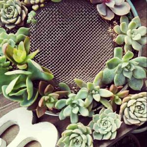 おはようございます。 過去picからですが、100均のザルを改造しハンドメイドした多肉のリース❤︎直径15㎝くらい カット苗を使用しました。