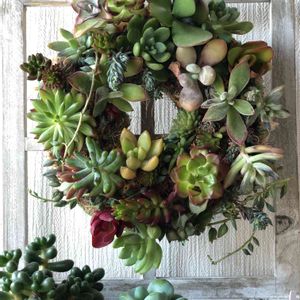 スカスカになっていた多肉のリースを手直し。 道端で摘んだセダムを足してもりもりにしましたよ✨