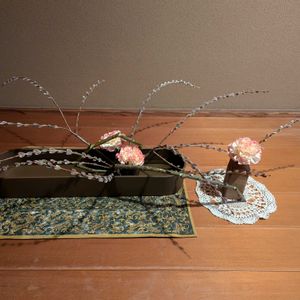 今回はテーブルなどに飾った場合を考えて、どこから見ても美しく見えるように生けるというテーマでした✨ テーブルに置いて飾るので、あまり作品の背を高くしないようにするのがポイントです。 少し洋風な考え方で、いつもとは違うところにも気を配る必要がありますが、勉強になりました! 小豆柳は矯めることで線に動きが出て、よりしなやかになりました🫘 カーネーションも色合いや形が可愛いです♪